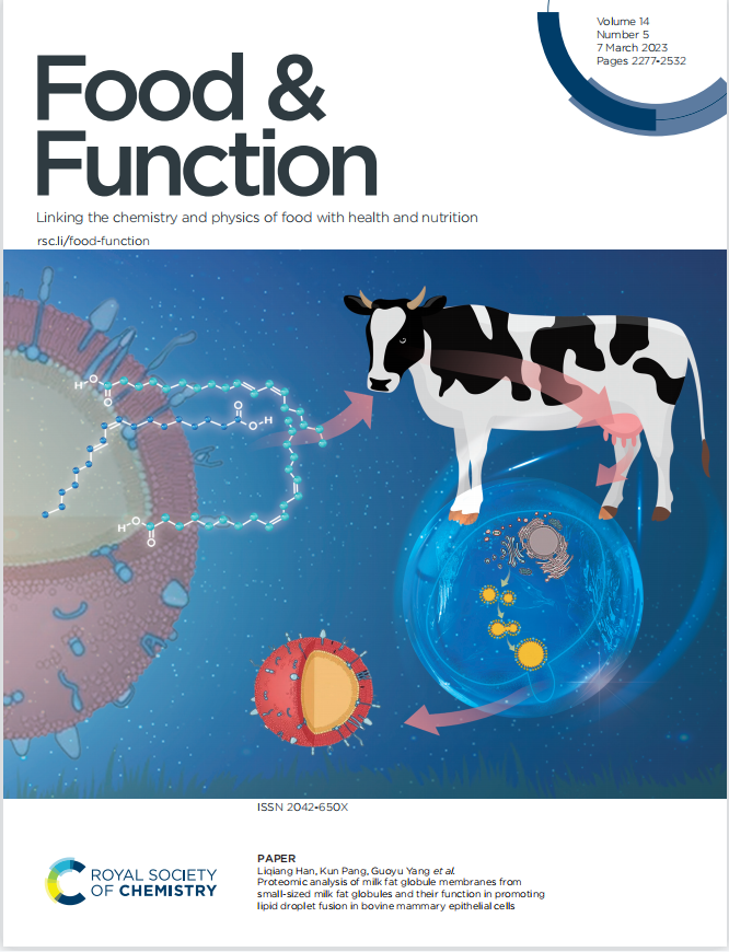 近日,工口漫画 、农业部动物生化与营养重点实验室韩立强、杨国宇教授团队在解析奶牛低乳脂综合症机制方面取得重要进展。研究成果以“Proteomic analysis of milk fat globule membranes from small-sized milk fat globules and their function in promoting lipid droplet fusion in bovine mammary epithelial cells”为题发表在英国皇家化学学会旗下的国际知名学术期刊《Food & Function》(中科院一区,Top期刊)上,并被遴选为封面文章(Outside Front Cover)。韩立强教授为论文第一作者兼通讯作者,杨国宇教授为通讯作者。该研究得到了国家自然科学基金(U1904116)的资助。