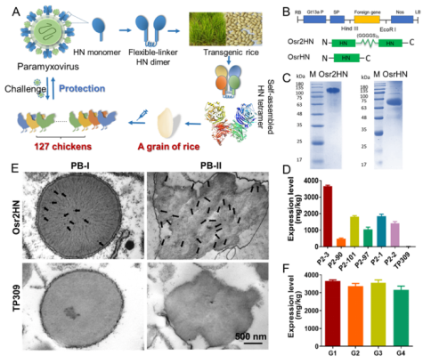 以副粘病毒科新城疫病毒(NDV)的受体结合蛋白——血凝素神经氨酸酶蛋白(HN)为例,研究团队利用水稻胚乳表达系统成功制备了一种高效的重组抗原Osr2HN。研究结果显示,Osr2HN蛋白在水稻胚乳中正确表达,并且表达量高达3.7mg/g。晶体结构和小角X射线散射数据显示,重组后的Osr2HN蛋白形成了“蝴蝶状”的四聚体结构,具有完全暴露的受体结合域和中和表位。