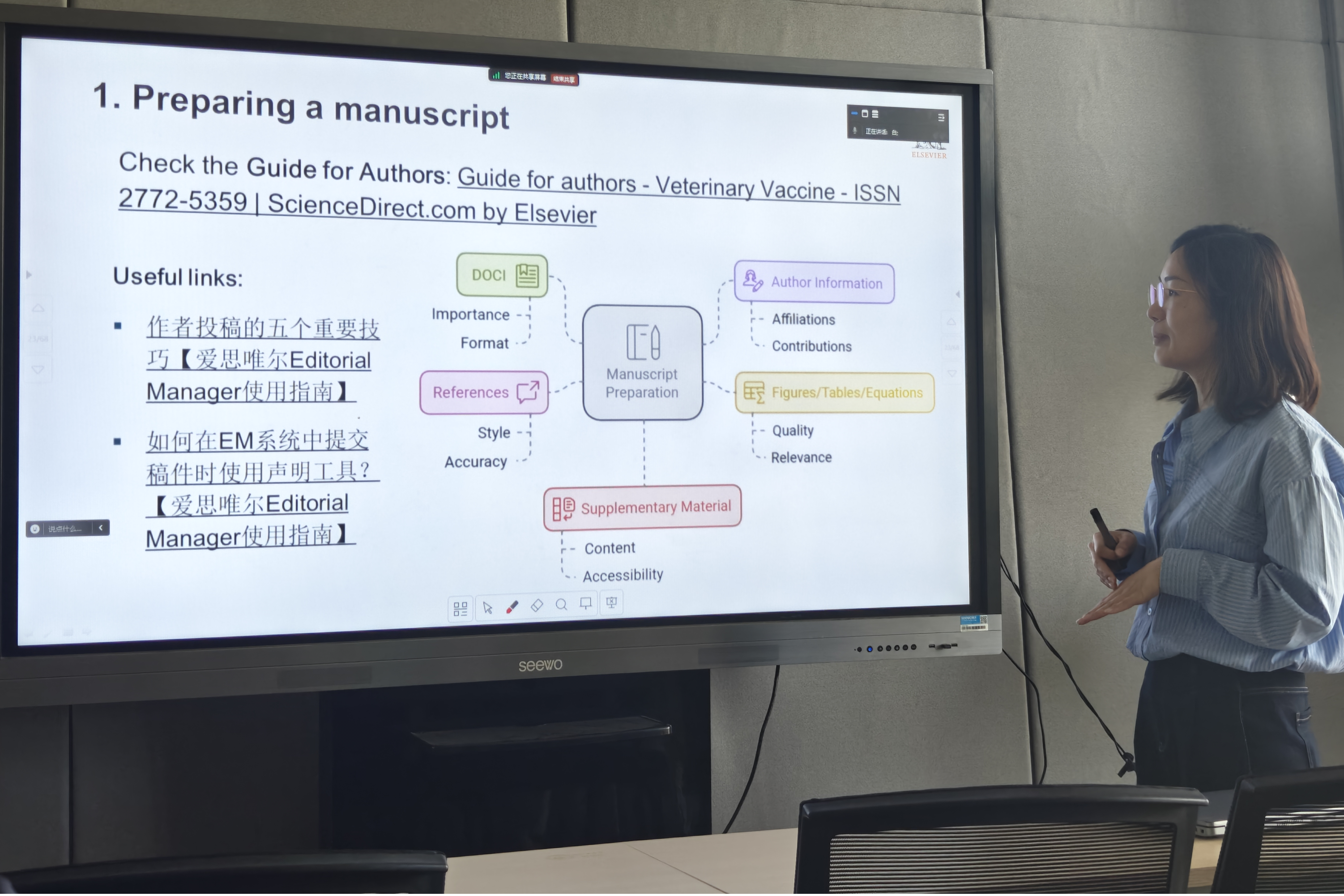 《Veterinary Vaccine》期刊经理刘晓果老师从另一个角度为参会者讲解了期刊从接收到出版的全流程,包括稿件接收后作者需要提供的信息、稿件的排版流程和最终确认,以及出版过程中需要注意的问题等,并为参会者提供多个英文学术写作和投稿线上教程。