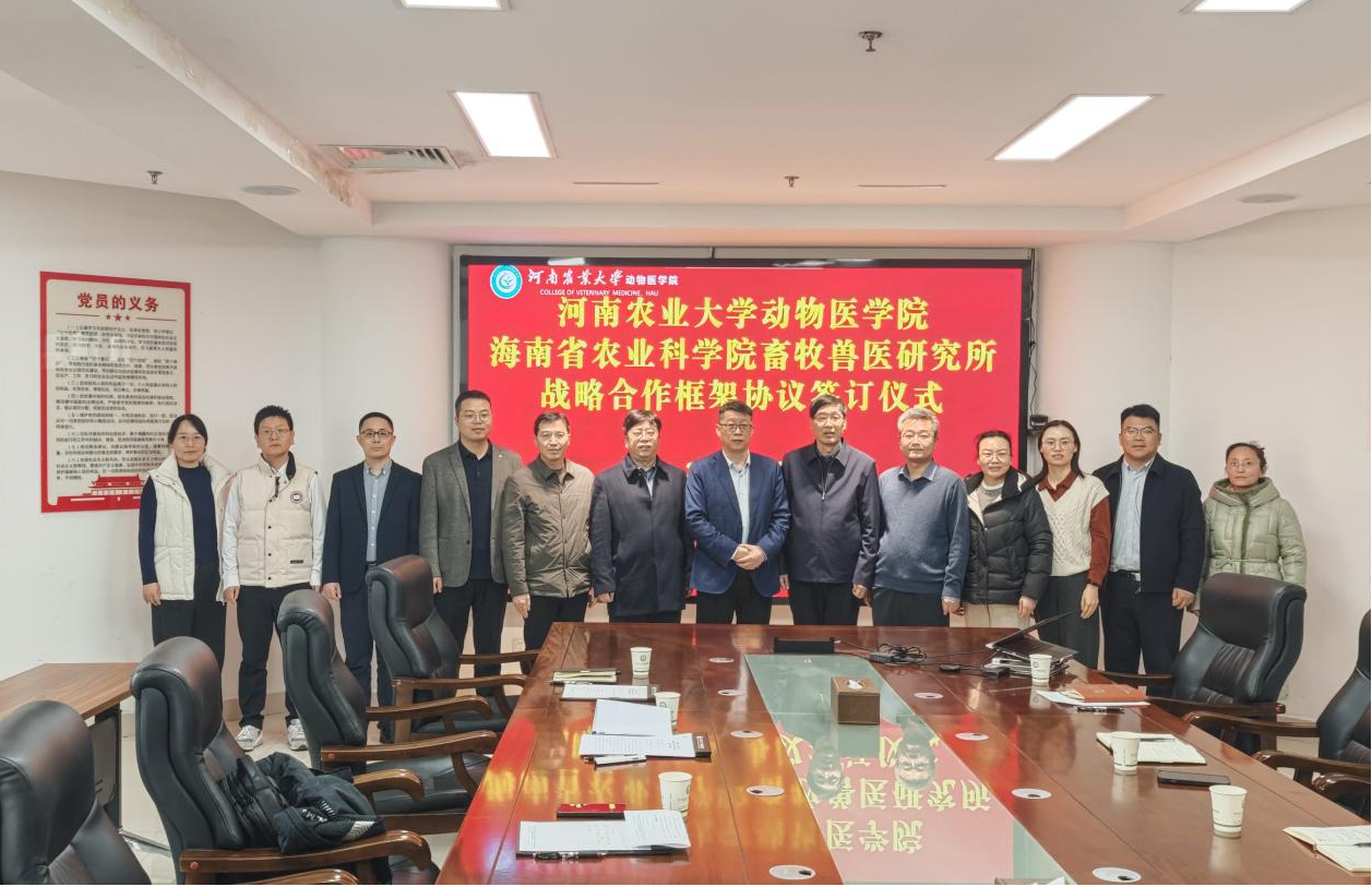 魏战勇对海南省农业科学院一行表示热烈欢迎,以“七个第一”为主题介绍了学院总体情况。他指出,我校兽医学科是我国高等院校中最早成立的兽医学科之一,在兽药检测、动物疫苗与诊断试剂研发、地方种质资源保护等方面具有显著优势。近年来学院的研究生招生规模与质量持续提升,培养条件不断优化,学生科研素养日益夯实,为双方合作奠定了坚实基础。魏战勇表示,双方合作前景广阔,希望未来能充分发挥河南农大的人才和科研优势,结合海南省农科院的实验平台与硬件资源,推动科研成果共享与人才联合培养,助力畜牧业现代化发展和乡村振兴作出新贡献。