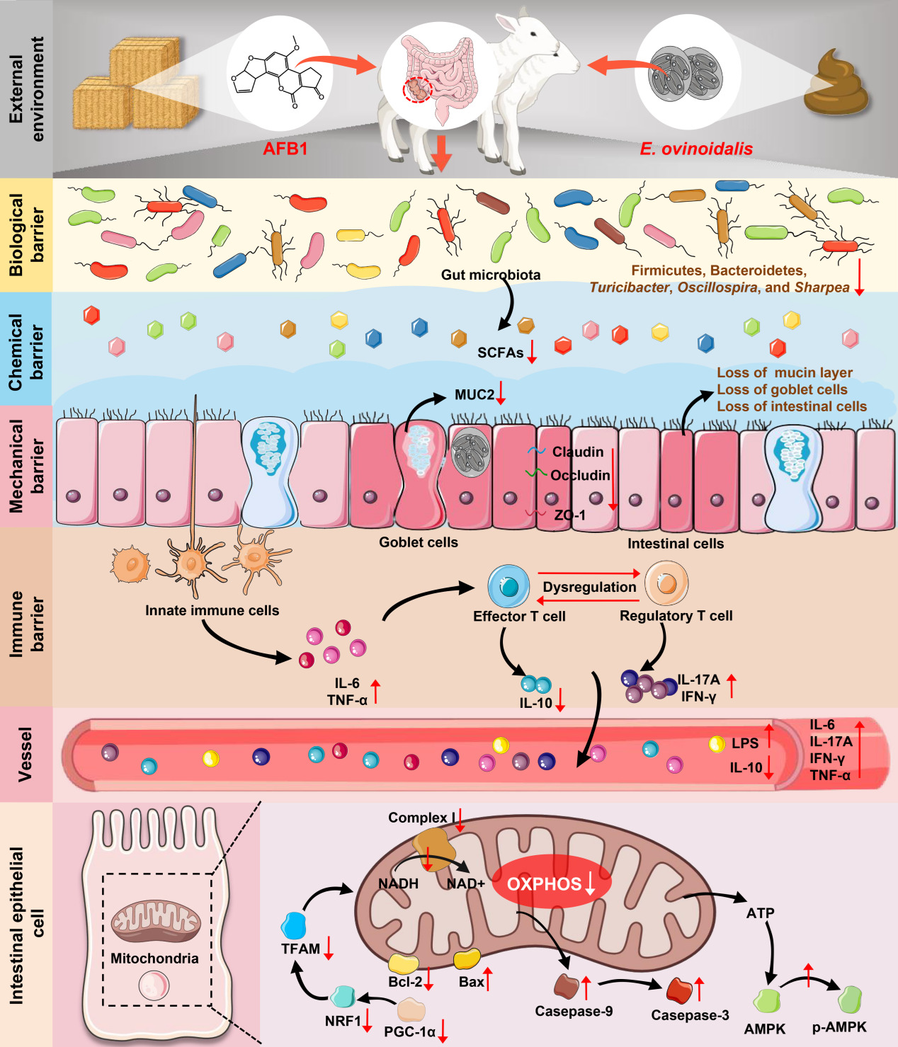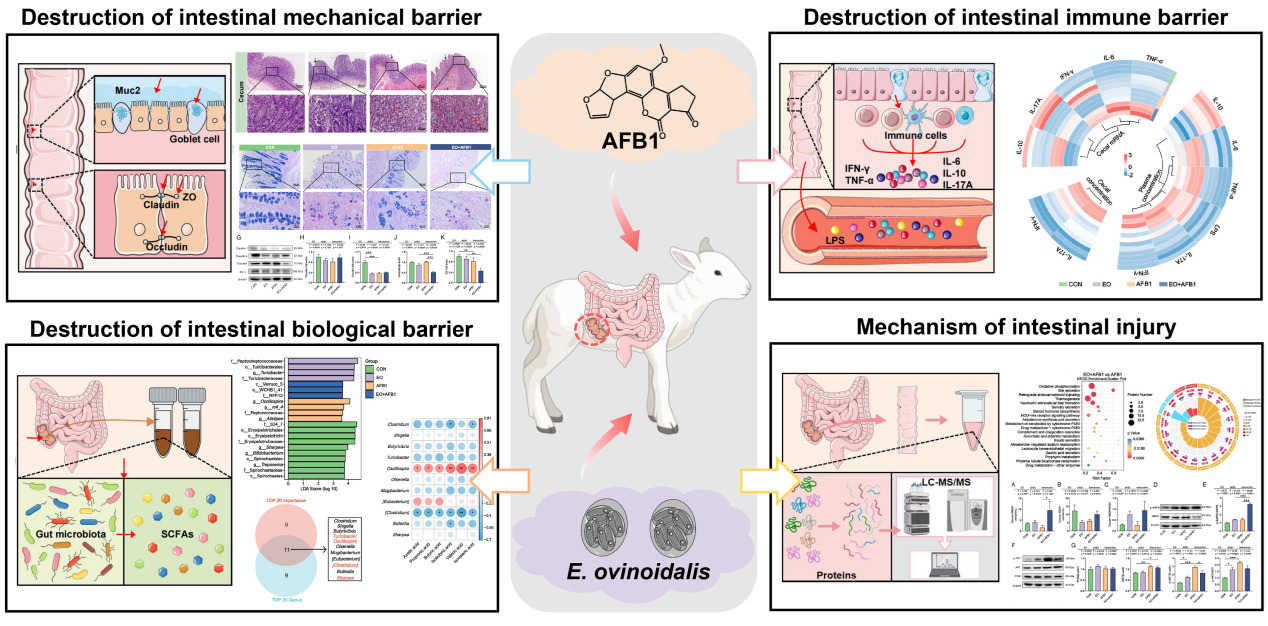 Aflatoxin B1 as a complicit in intestinal damage caused by Eimeria ovinoidalis in lambs: Novel insights to reveal parasite-gut battle”的研究论文。此项研究发现暴露于黄曲霉毒素B1(AFB1)可以干扰球虫在肠道内的增殖状态,并调控球虫感染羔羊肠道形态、肠道屏障功能、肠道菌群稳态、肠道炎症以及全身免疫的变化。此外,利用蛋白质组学分析揭示了AFB1与球虫共同存在下导致羔羊肠道损伤的潜在作用机制。