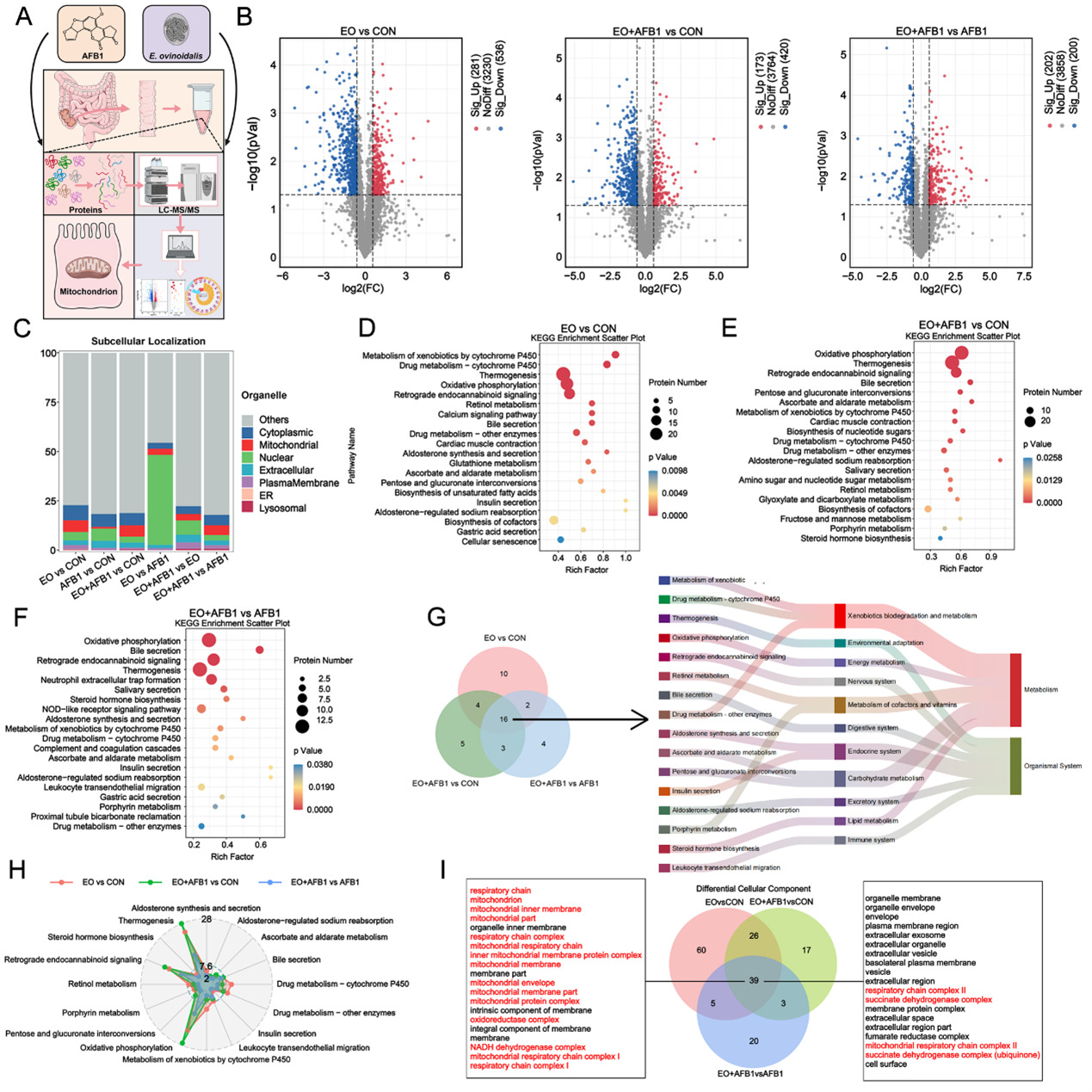 球虫病是由艾美耳属的多种球虫寄生于畜禽肠道所引起引起的在世界范围内广泛流行危害严重的疾病。以往研究证实,家禽食用被霉菌毒素污染的饲料会提高宿主对球虫的易感性,但这尚未在反刍动物中得到充分的研究。此外,肠道作为抵御有害物质进入机体内环境的第一道屏障,不仅是AFB1的主要暴露部位还是球虫发育和繁殖的场所。因此,本研究首次以绵羊为动物模型来深入探研究AFB1是否干扰宿主对球虫的易感性,以及AFB1和球虫联合作用时,是否影响球虫对肠道结构以及功能的破坏程度,同时基于蛋白组学揭示两种因素共存在下导致肠道损伤的分子机制(图1)。