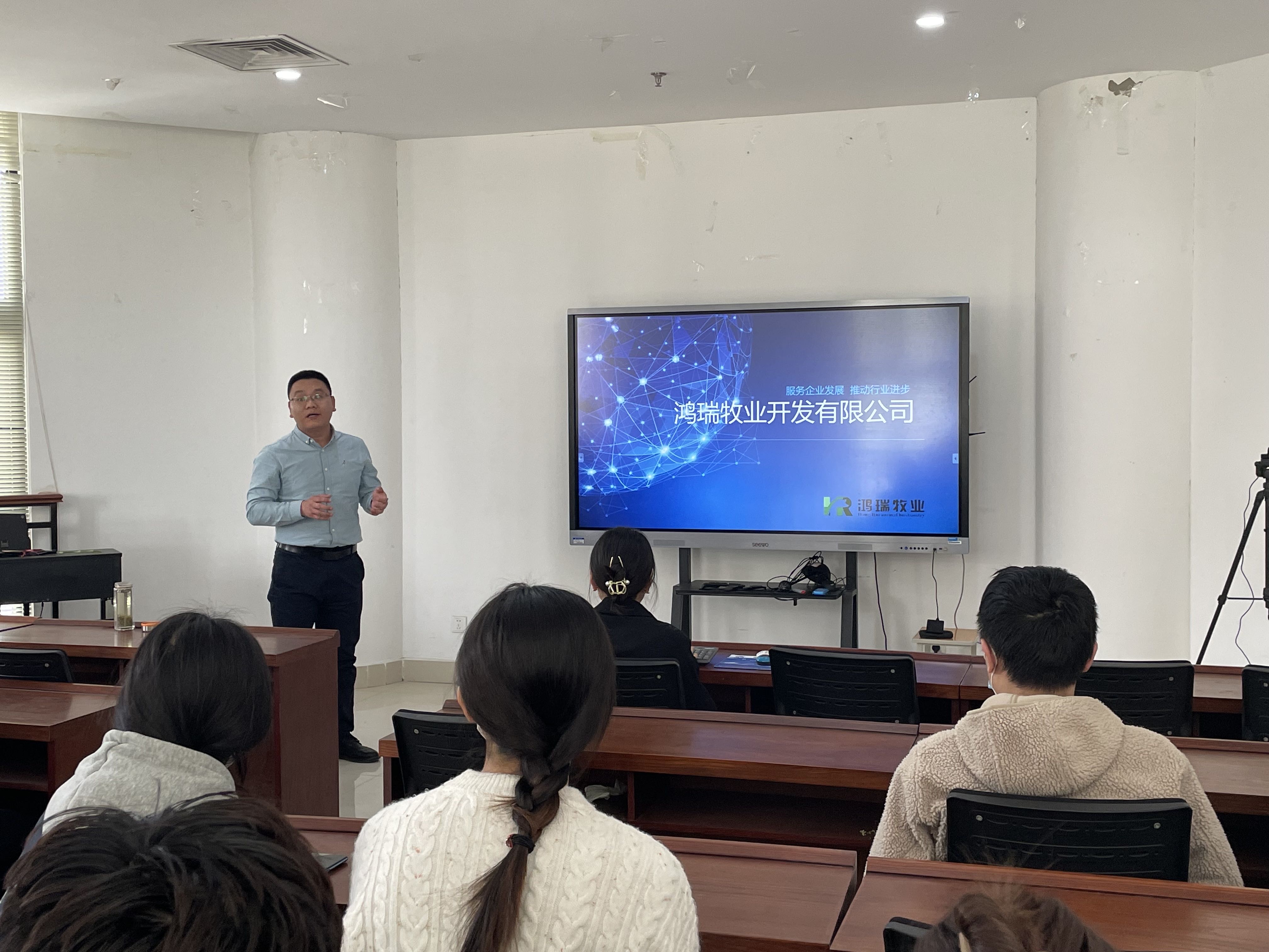 池永青对鸿瑞牧业的基本情况、业务布局、未来规划做了详细的讲述,并对发展前景、人才培养、薪资待遇等方面做了详细介绍。王鸿康对企业的发展理念、企业优势进行了讲解,并表示对人才的渴求。池永青热情回答了学生提出的薪资待遇、职业发展等的相关问题。