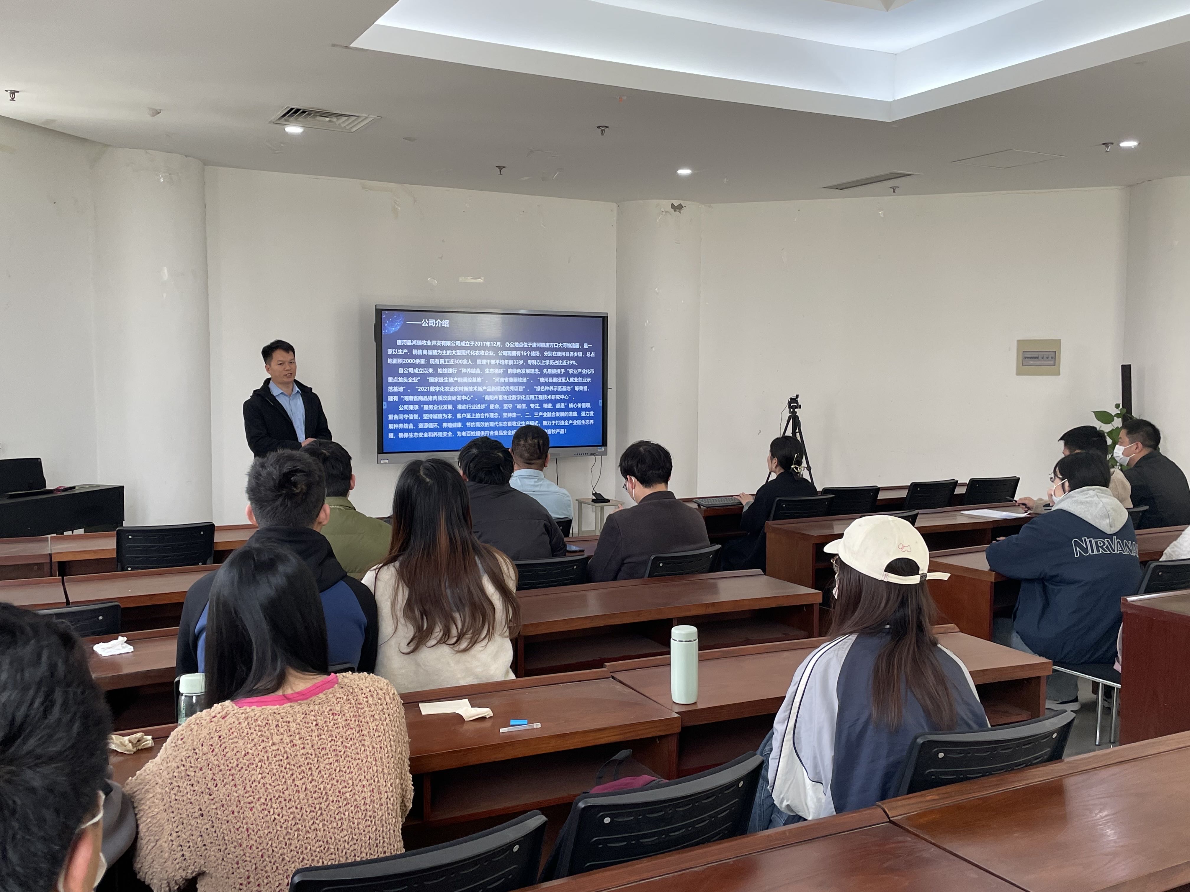 举办专场招聘宣讲会。唐河鸿瑞牧业总经理王鸿康、人力资源部总监池永青、总经理助理魏飒飒、人资经理兰欣、部分毕业生代表及团委老师参加了本次宣讲会。