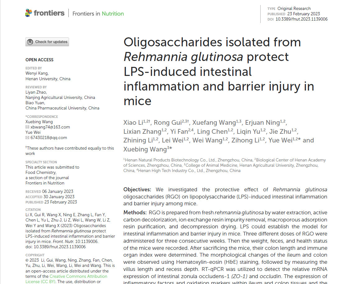 地黄是河南道地药材,试验从地黄中分离鉴定了地黄低聚糖(RGO),并探究了RGO对LPS诱导的小鼠肠道炎症和屏障损伤的保护作用。结果表明,分离得到的RGO能显著提高小鼠体重、结肠长度和胸腺、胰腺指数,提高肠道屏障相关连接蛋白ZO-1和Occludin的表达量,改善肠道组织结构。降低小鼠肠道组织中IL-6、IL-17、IL-1β、TNF-α含量,降低MDA含量,提高SOD、GSH-Px和CAT活性。促进回肠中胰蛋白酶、胰脂肪酶的活性,提高结肠中乙酸、丙酸、丁酸等短链脂肪酸的含量。肠道菌群研究表明,RGO还可增加小鼠肠道中乳杆菌及阿克曼菌的相对丰度,降低放线菌门的相对丰度,使肠道微生物结构向益生菌占主导地位转变。RGO对小鼠肠道炎症和肠道屏障的保护作用可能与调节肠道菌群结构有关。