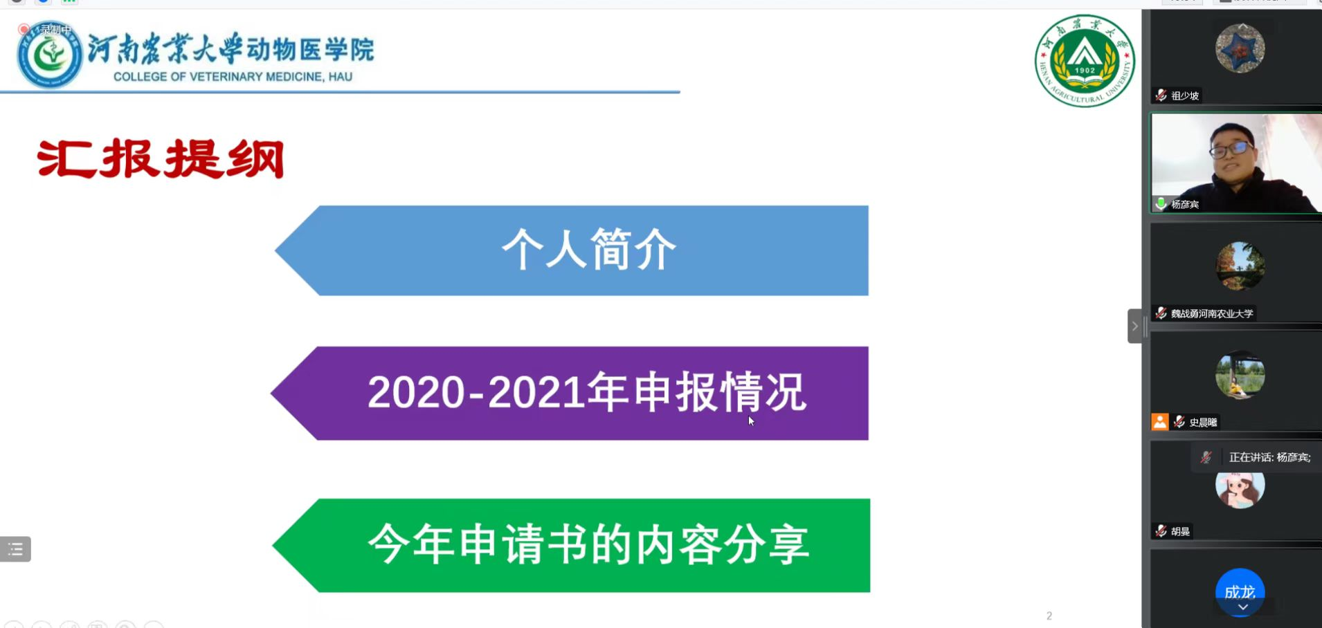 2022年青年基金项目获得者杨彦宾老师作了基金申报的经验分享。杨老师首分享了自己往年跨学科申请项目的心路历程,对今年已中的项目进行了详细汇报。报告会上老师们提出如何才能更好进行学科交叉,杨老师结合自己的亲身体会给出了详细解答,与会老师们都感受到了学科交叉融合的重要性,并表示一定要开拓视野,努力实现兽医学科与其他学科的交叉融合。