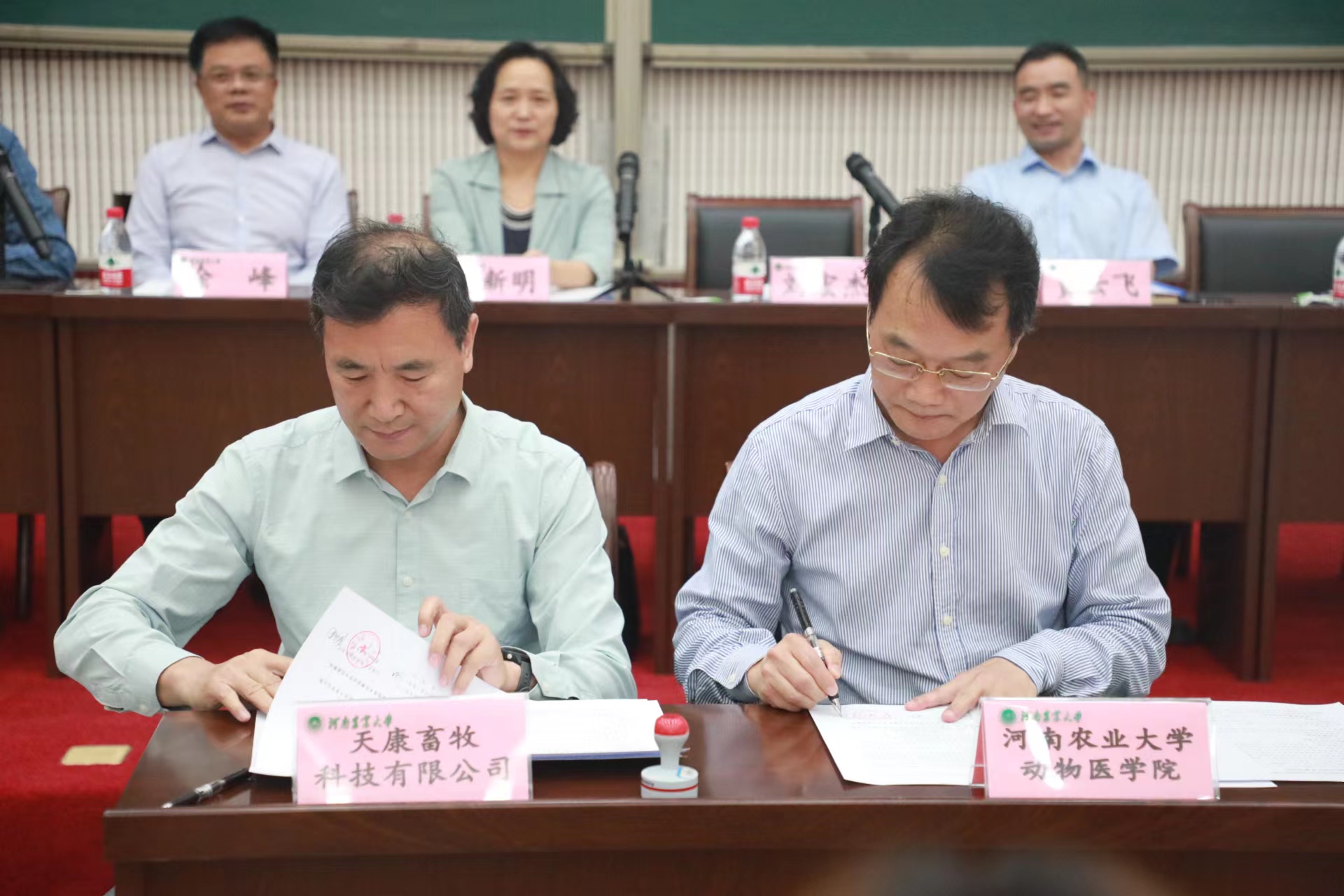 党委书记廖仲磊、院长张龙现、党委副书记杜家方、副院长韩立强出席了签约仪式。天康畜牧科技有限公司饲料营养总监朱文涛、人资总监闫辉、人资经理吕臣豪、招聘经理宋家林、新入职员工朱世豪及21级动物医学专业学生参加了签约仪式。仪式由廖仲磊主持。