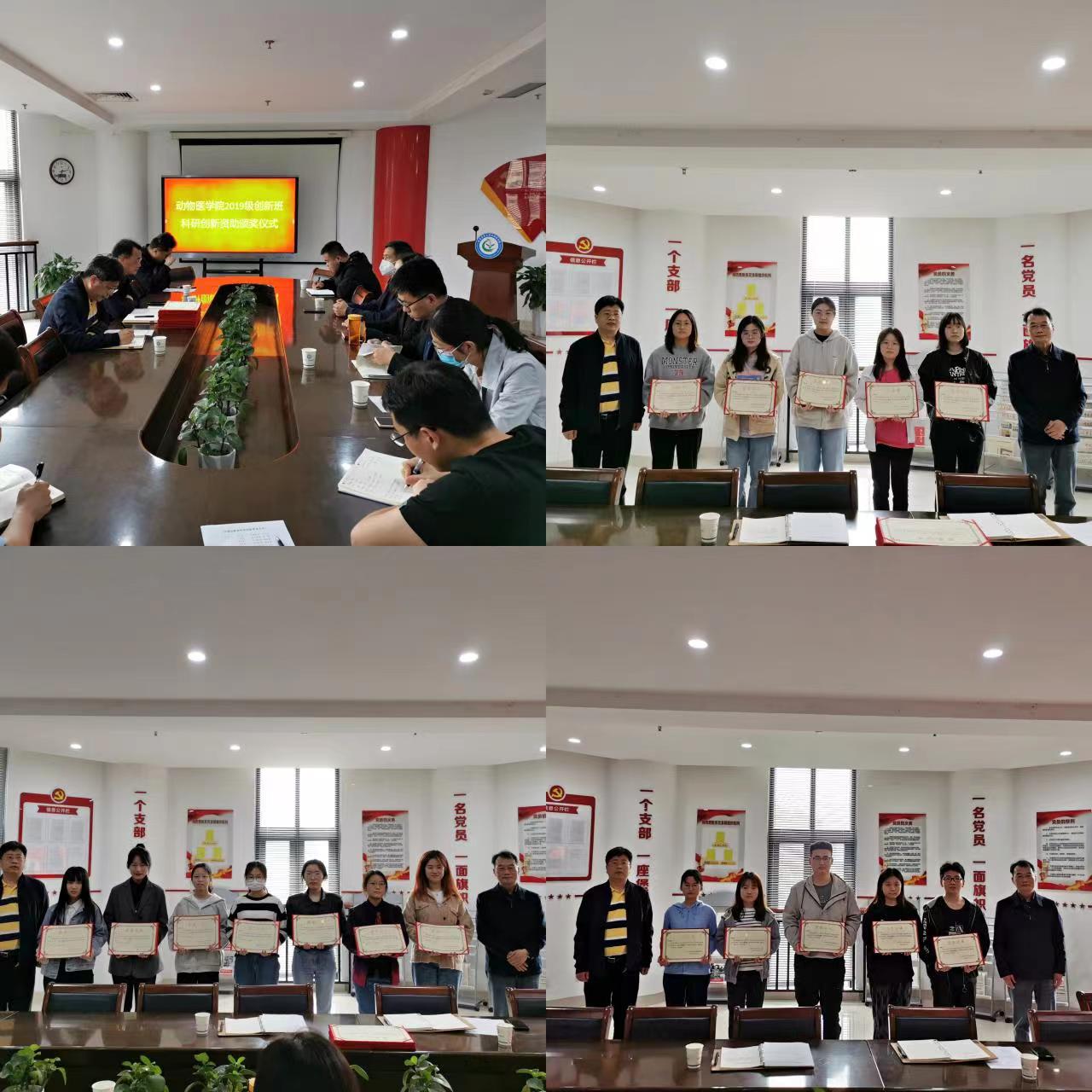 在第一实验楼北430会议室举行2019级动物医学创新班科研创新资助颁奖仪式。院长张龙现、副院长魏战勇、教学秘书韩立强出席颁奖仪式。2019级部分学业导师、2019级创新班全体同学参加了颁奖仪式。颁奖仪式由韩立强主持。