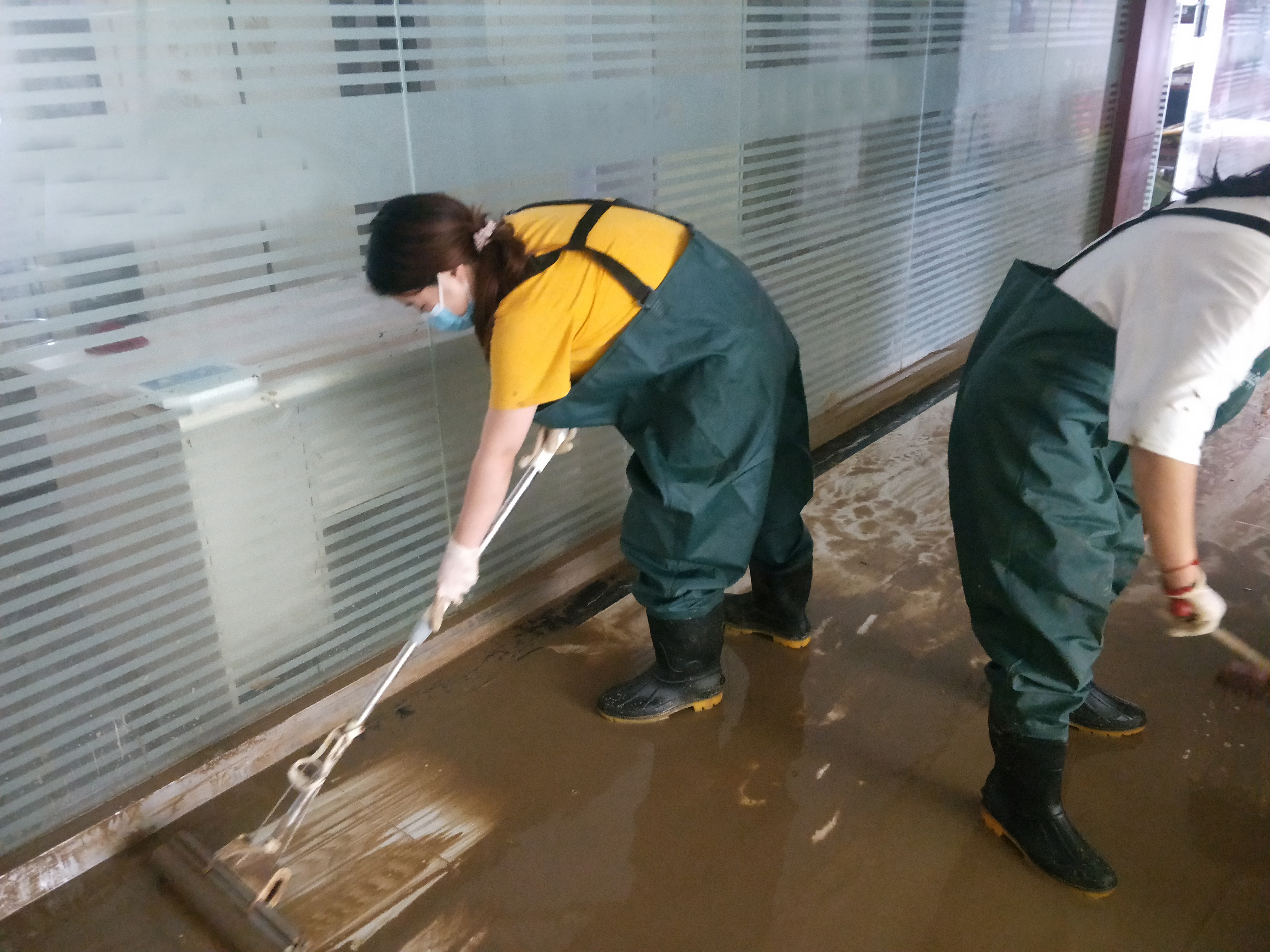 女生们清理实验室的渗水