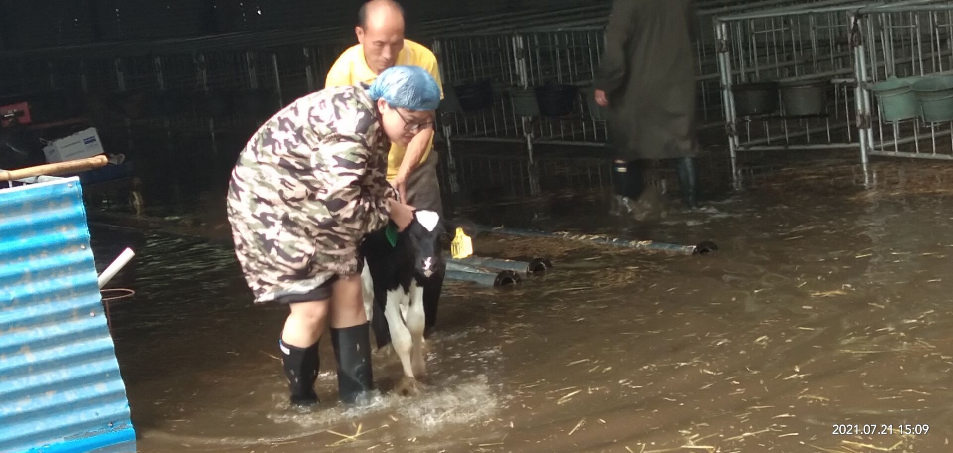 吴亚楠老师所在的河南省开封市通许牧原十四场区,于20日晚上笼罩在风雨雷电之中,仓库开始漏水、险情频发。作为实习带队老师,吴亚楠保证学生安全的同时,带领男生帮助企业搬运物资,减少了因洪灾引发的损失,还主动为场区驻守的抗洪人员运送食物。商艳红老师所在的原阳河南花花牛畜牧科技有限公司,犊牛圈被淹,需要紧急转移犊牛。商艳红带领实习学生参与到转移犊牛的行动中,共转移犊牛70余头,确保了场区犊牛的安全。宋亚鹏老师所在的河南省动物疫病预防控制中心也遭到了暴雨的考验。宋亚鹏带领男生们挥动着铁锹,用泥土袋在门口拉起了一道防洪屏障;女生们拧干拖把,用簸箕和水桶清理掉实验室的渗水,尽最大力量保护实验室内的仪器及样品。项玉强和王彦彬老师所在的豫北某饲料添加剂厂受损严重。两位老师第一时间协调救灾物资,以保证实习生们的饮用水和食物供应,并指导实习生分工协作地帮助场区清理淤泥、转移实验室样品,以减轻企业在洪灾中的损失。