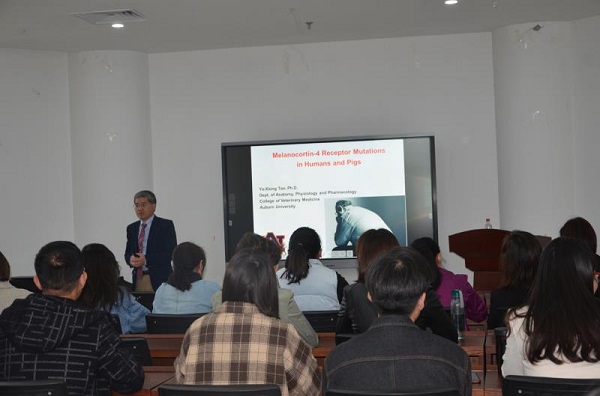 师生开展了题为《Melanocortin-4 receptor mutations in human and pigs》的学术交流讲座。学院相关教师、博士研究生、硕士研究生参加报告会。会议由动物生产系统与工程系主任田亚东教授主持。