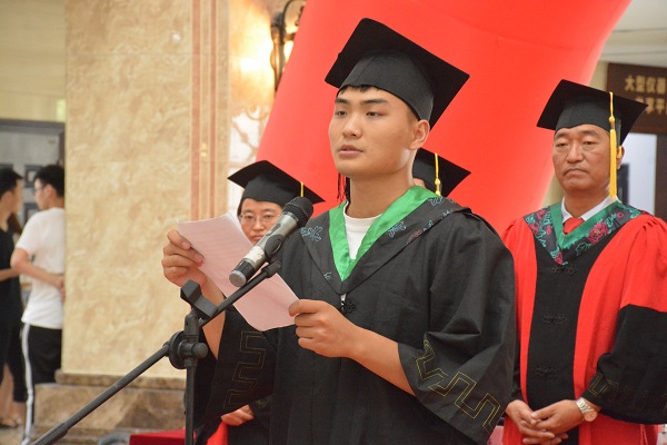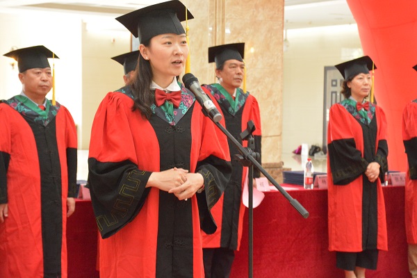 随后,本科生毕业生代表2015级水产养殖2班石今朝带领全体毕业生高呼三遍牧医精神,重温牧医精神带来的感动与激励。研究生毕业生代表2016级动物遗传育种与繁殖专业田卫华上台发言。她以自己七年来在牧医的求学经历为出发点,感慨牧医是她成长的见证者、精神的指引者,同时她也见证了牧医的发展。她表示,在这的七年里自己收获了很多,当离别时刻到来时,更是发现十六字的牧医精神已深入到了骨血之中。石今朝回顾了大学四年学习、工作感受,牧医这个大家庭带给自己太多的感动,太多的不舍。在这依依惜别之际,他感慨时光飞逝,但牧医将成为大家心中永远无法抹去的独家记忆和心灵圣地,由届届牧医人不断接续新的篇章。