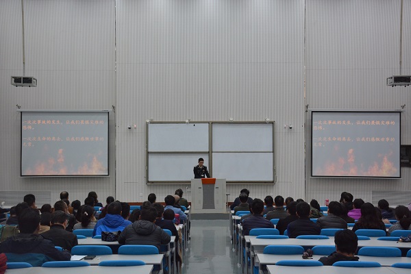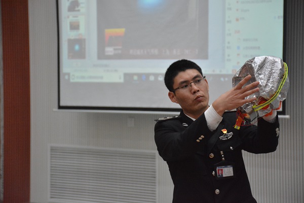 讲座伊始,彭冲通过视频和PPT向师生展示了几个令人痛心的火灾案例,并针对火灾的不同起因,围绕家庭、小区、学校和单位等不同场所,就防火、自救逃生和消防器材使用等消防安全常识进行了详细生动的介绍。会上,他还演示了不锈钢水基灭火器、防毒面具等各种消防器材的使用。