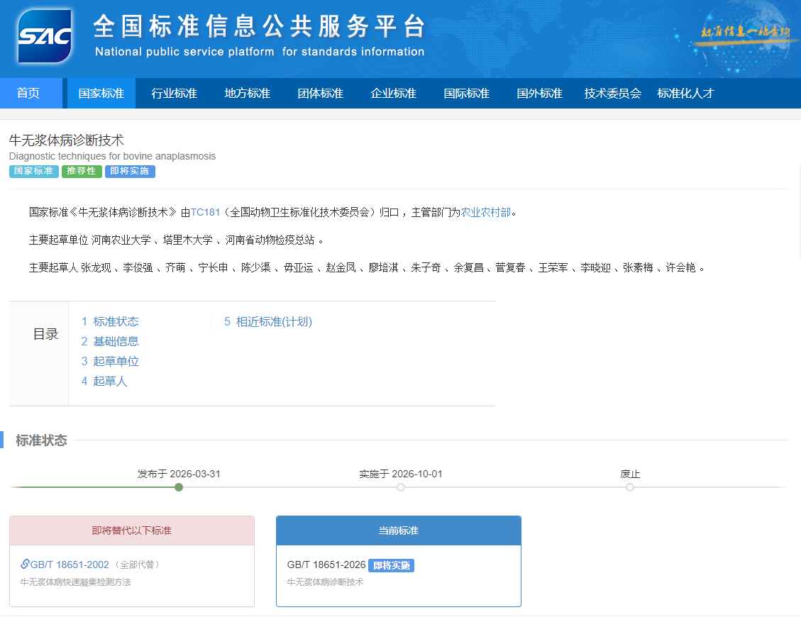 近日,从国家市场监督管理总局(国家标准化委员会)2026年第15号公告,以及全国标准信息公共服务平台获悉,由我院张龙现教授牵头,联合塔里木大学和河南省动物检疫总站,共同修订的国家标准《牛无浆体病诊断技术》(GB/T 18651-2026)于2026年3月31日正式发布,将替代GB/T 18651-2002,于2026年10月1日起正式实施。该标准的制定工作在2023年度十四五国家重点研发计划项目“畜禽寄生虫病防控技术研发与应用”(项目编号2023YFD1801200)和河南省重点研发专项“动物源重要人兽共患病源头防控措施与关键技术创新”(231111111500)支持下完成,修订了牛无浆体病诊断诊断领域的国家标准体系,为该病科学防控提供权威技术支撑。