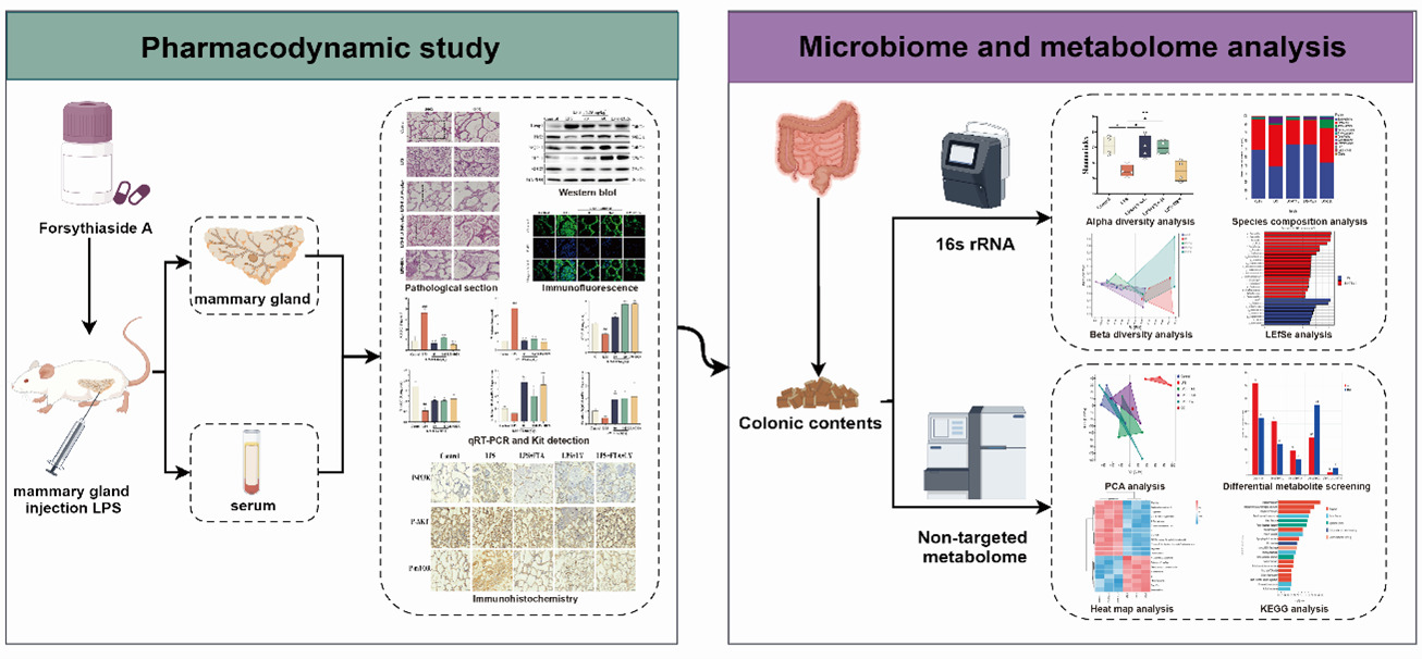 本研究证实连翘酯苷A能够减轻LPS诱导的小鼠乳腺炎。此外,连翘酯苷A可以通过抑制PI3K/AKT/mTOR信号通路,激活自噬,降低炎症因子和凋亡基因的表达,从而修复炎症诱导的血乳屏障损伤。进一步的微生物组学和代谢组学显示,连翘酯苷A对乳腺炎的缓解作用与抑制有害细菌和有害代谢物、促进有益细菌和有益代谢物的能力高度相关。这些结果为FTA治疗奶牛乳腺炎的临床应用提供了新的依据。