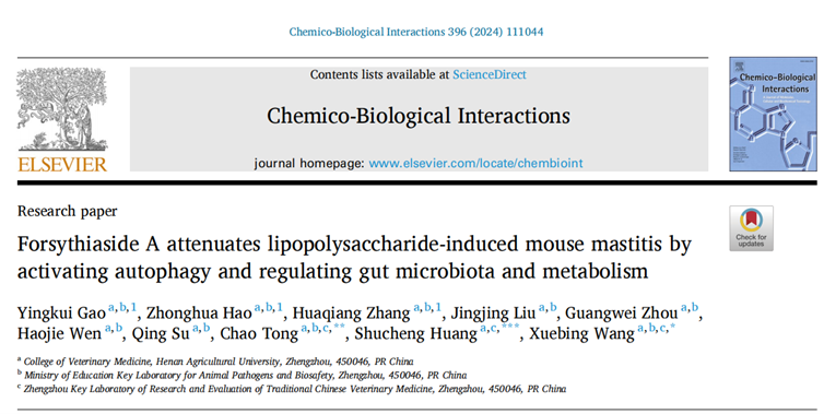 王学兵教授团队在国际知名学术期刊《Chemico-Biological Interactions》上发表了题为“Forsythiaside A attenuates lipopolysaccharide-induced mouse mastitis by activating autophagy and regulating gut microbiota and metabolism”的研究论文,文章探讨了连翘酯苷A对于小鼠乳腺炎的作用效果及作用机制,以期为连翘酯苷临床防治抗乳腺炎的开发利用提供理论基础和试验依据。